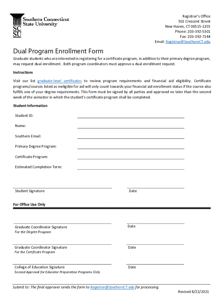 The dual program enrollment form is a document that allows students to enroll in two academic programs simultaneously.
