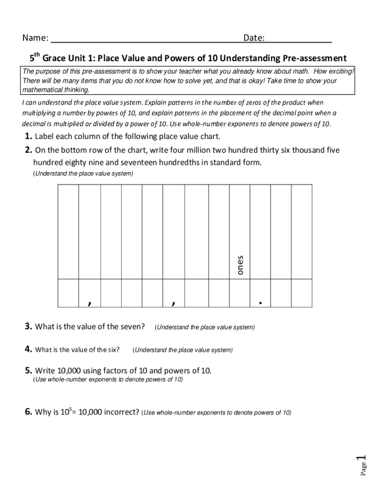 Name:Date:5th Grace Unit 1: Place Value and Powers of 10 Understanding Preassessment The purpose of this preassessment is to show your teacher what you already know about math. How exciting! There