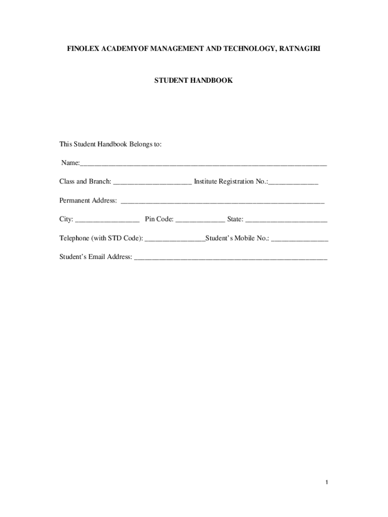 FINALE ACADEMY MANAGEMENT AND TECHNOLOGY, RATNAGIRISTUDENT Handbooks Student Handbook Belongs to: Name:___ Class and Branch: ___ Institute Registration No.:___ Permanent Address: ___ City: ___ Pin