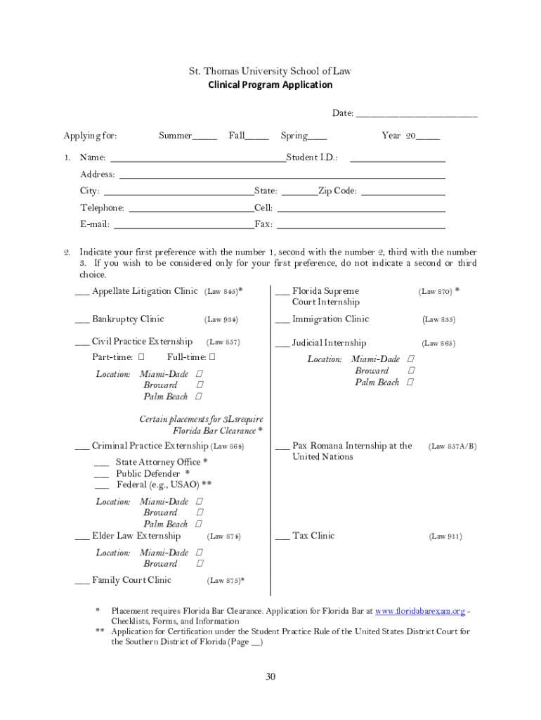 St. Thomas University School of Law Clinical Program Application Date: ___ Applying for:Summer___Fall___Spring___1. Name:Year 20___Student I.D.:Address: City:State:Telephone:Cell:Email:Fax:Zip Code:2.