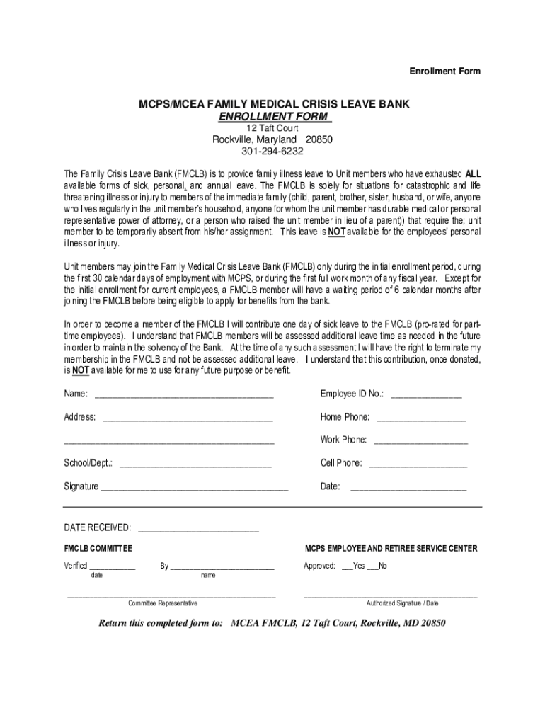 Enrollment Formicas/CEA FAMILY MEDICAL CRISIS LEAVE BANK ENROLLMENT FORM 12 Taft CourtRockville, Maryland 20850 3012946232 The Family Crisis Leave Bank (FM CLB) is to provide family illness leave
