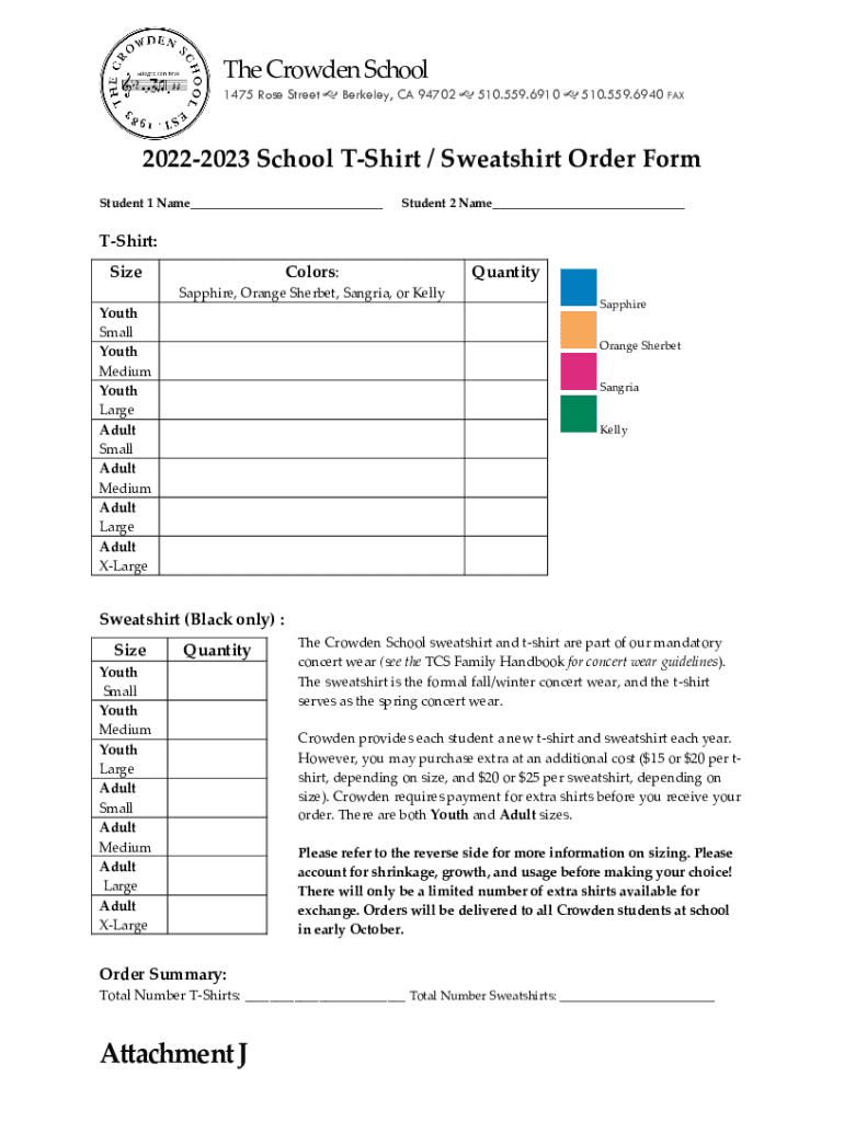 The Crowded School1475 Rose Street Berkeley, CA 94702 510.559.6910 510.559.6940 FAX20222023 School Shirt / Sweatshirt Order Form Student 1 Name___Student 2 Name___TShirt: Recolors: Sapphire, Orange