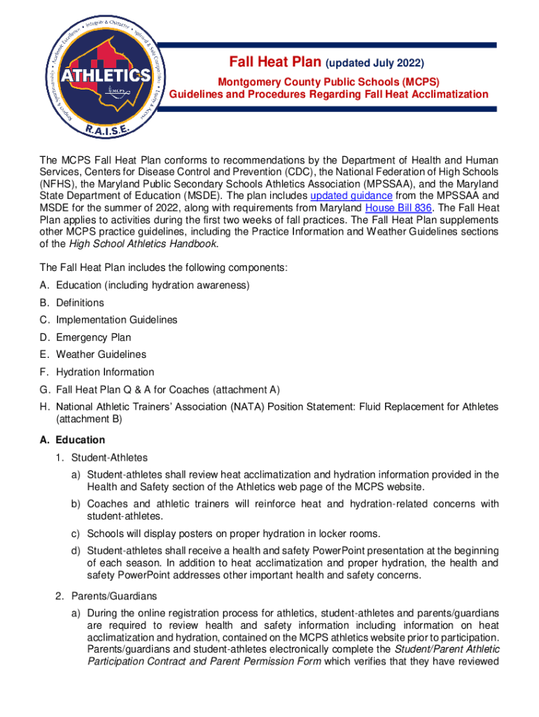 Fall Heat Plan (updated July 2022) Montgomery County Public Schools (MCPS) Guidelines and Procedures Regarding Fall Heat Acclimatization MCPS Fall Heat Plan conforms to recommendations by the Department