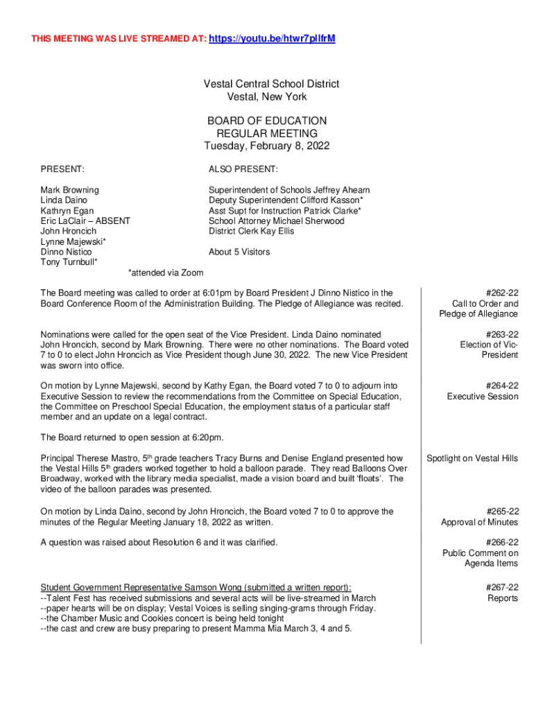 THIS MEETING WAS LIVE STREAMED AT: https://youtu.be/htwr7plIfrMVestal Central School District