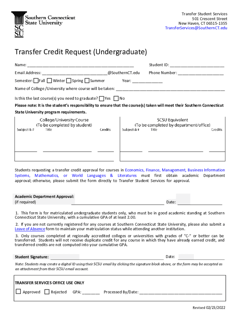 Transfer Student Services 501 Crescent Street New Haven, CT 065151355 TransferServices@SouthernCT.eduTransfer Credit Request (Undergraduate) Name: ___Student ID: ___Email Address: ___@SouthernCT.eduPhone