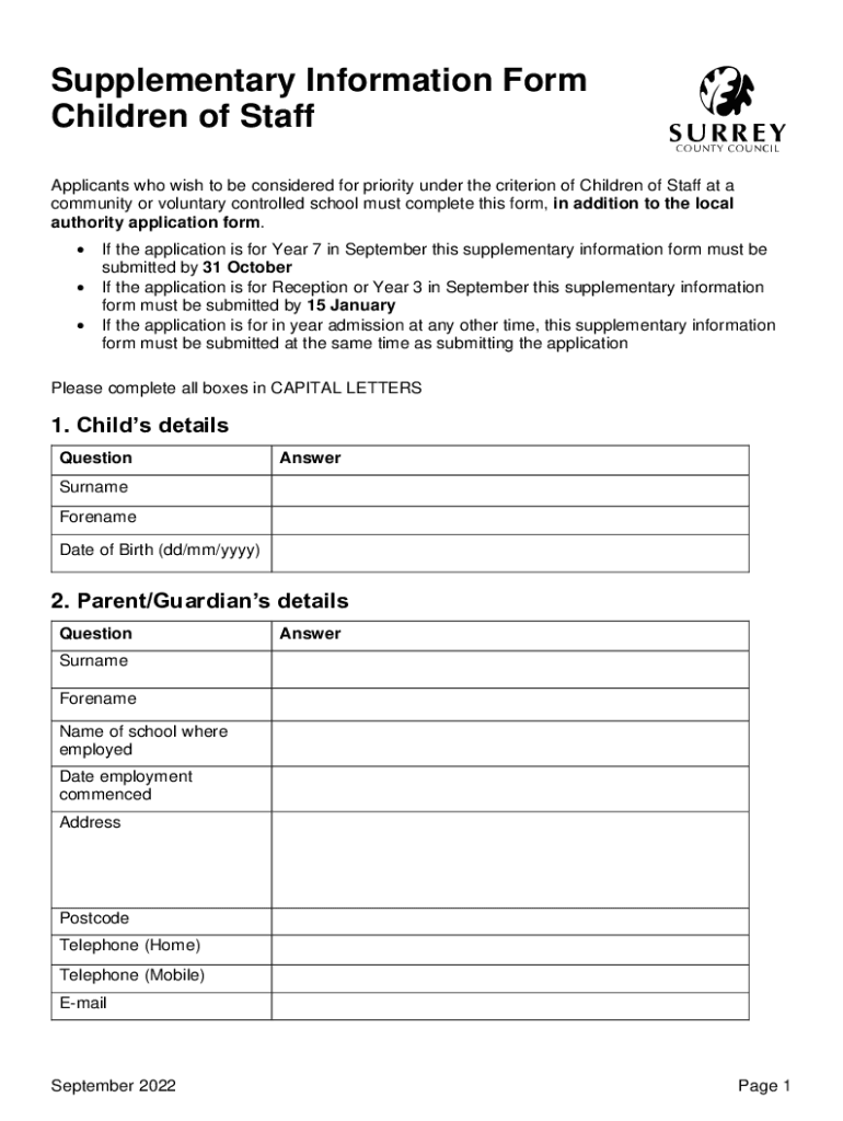 Supplementary Information Form Children of StaffsApplicants who wish to be considered for priority under the criterion of Children of Staff at a community or voluntary controlled school must complete