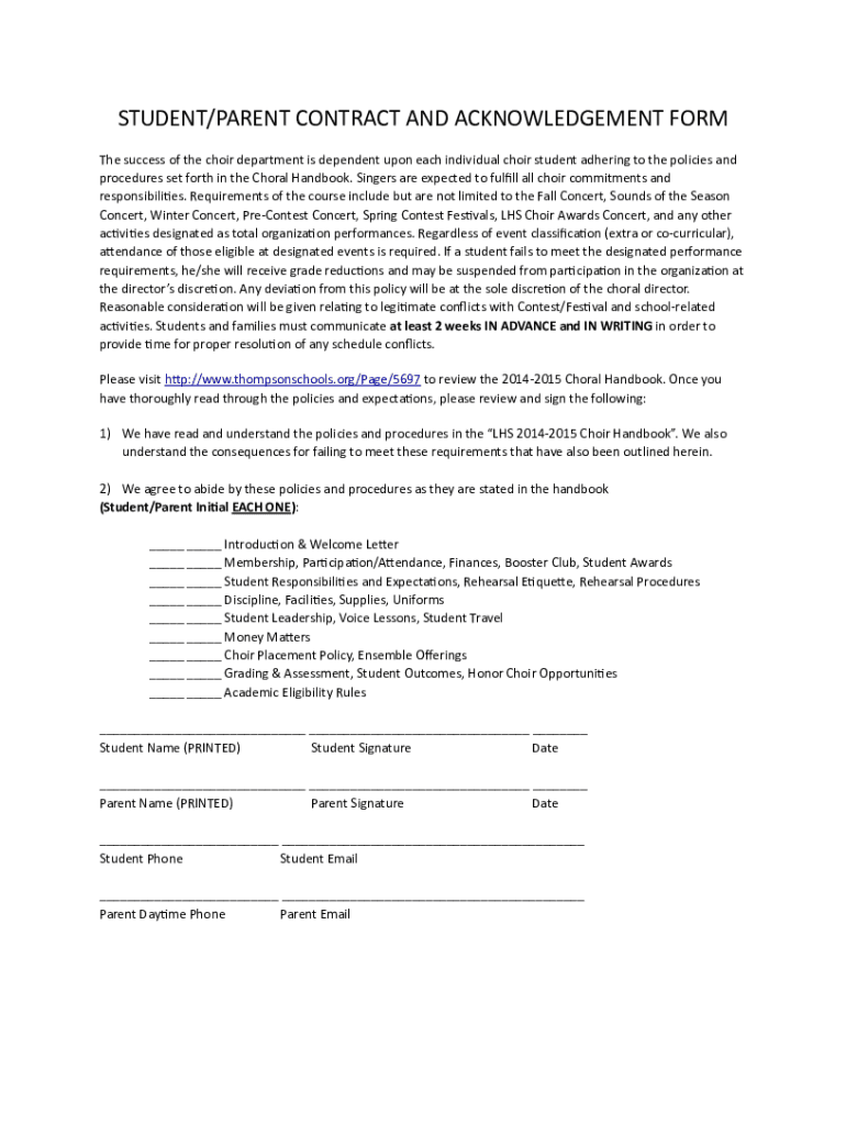 STUDENT/PARENTCONTRACTANDACKNOWLEDGEMENTFORM Thesuccessofthechoirdepartmentisdependentuponeachindividualchoirstudentadheringtothepoliciesand proceduressetforthintheChoralHandbook. Singersareexpectedtofulllallchoircommitmentsand