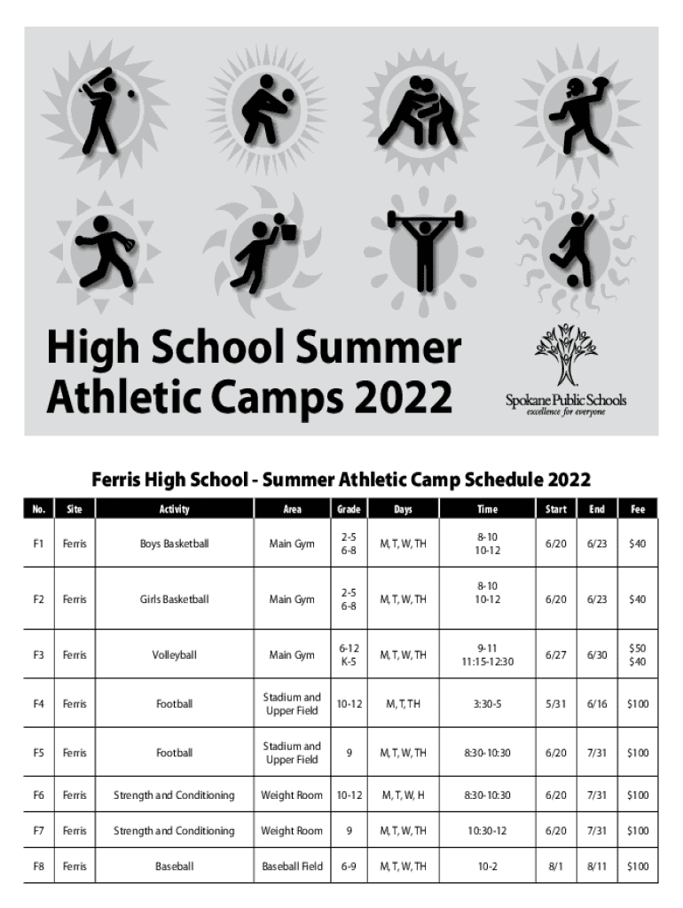 High School Summer Athletic Camps 2022 Ferris High School Summer Athletic Camp Schedule 2022 No. SiteActivityAreaGradeDaysTimeStartEndFeeF1FerrisBoys BasketballMain Gym25 68M, T, W, TH810 10126/206/$2340F2FerrisGirls
