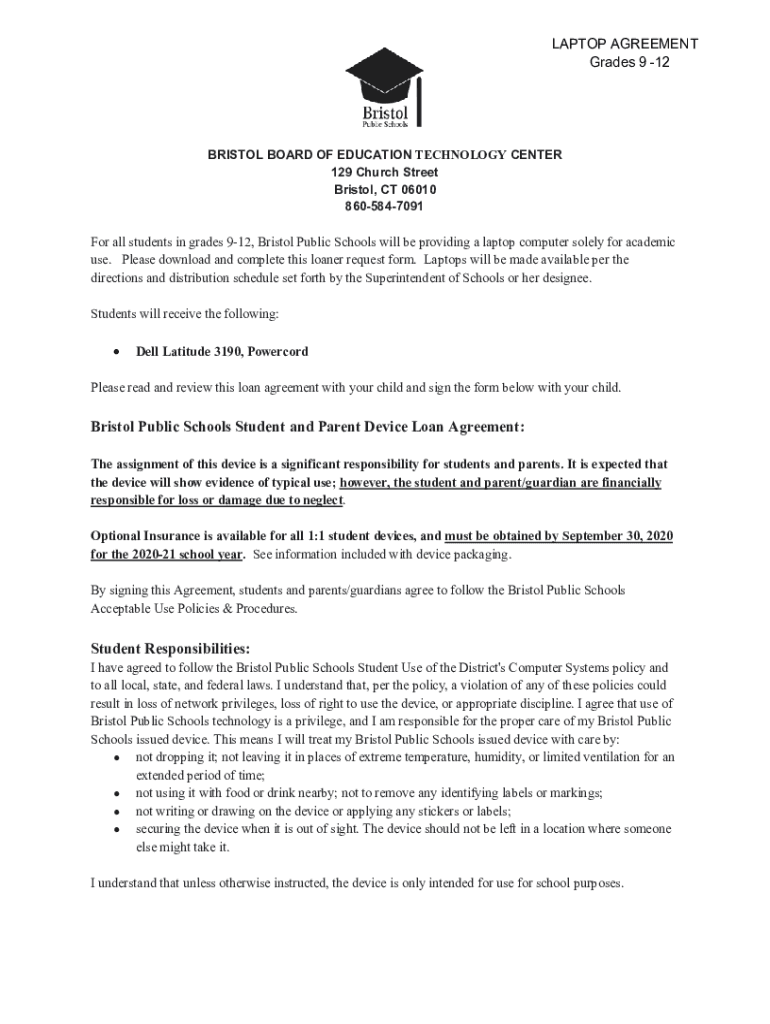 LAPTOP AGREEMENT Grades 9 12BRISTOL BOARD OF EDUCATION TECHNOLOGY CENTER 129 Church Street Bristol, CT 06010 8605847091For all students in grades 912, Bristol Public Schools will be providing a laptop