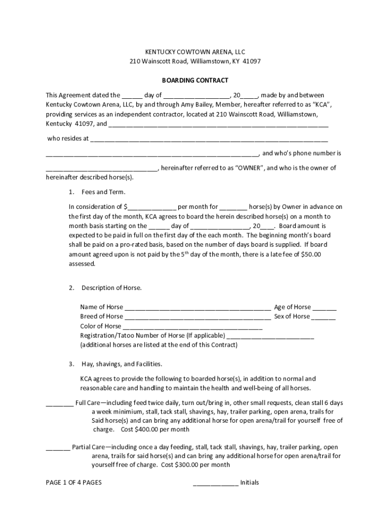 KENTUCKY DOWNTOWN ARENA, LLC 210 Wainscot Road, Williams town, KY 41097 BOARDING CONTRACT This Agreement dated the ___ day of ___, 20___, made by and between Kentucky Cow town Arena, LLC, by and through