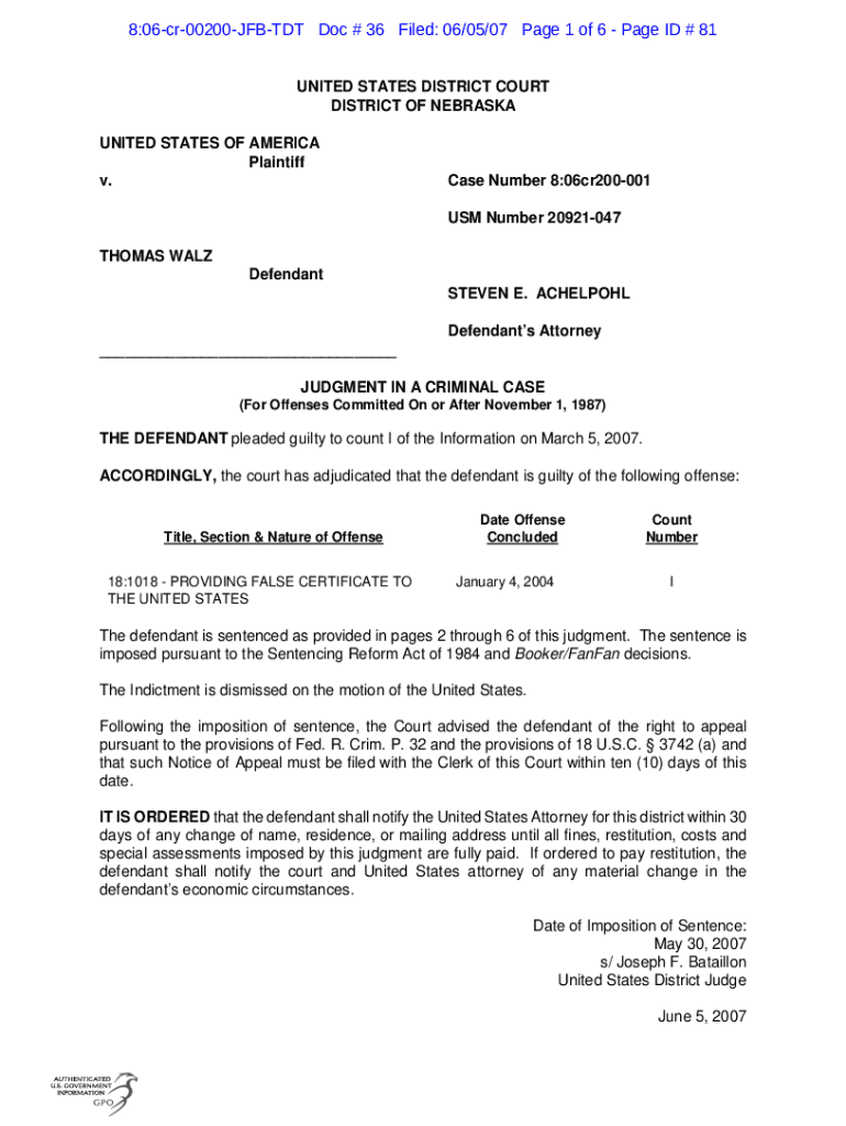 8:06cr00200JFBTDT Doc # 36 Filed: 06/05/07-Page 1 of 6-Page ID # 81 UNITED STATES DISTRICT COURT DISTRICT OF NEBRASKA UNITED STATES OF AMERICA Plaintiff v. Case Number 8:06cr200001 US Number 20921047THOMAS