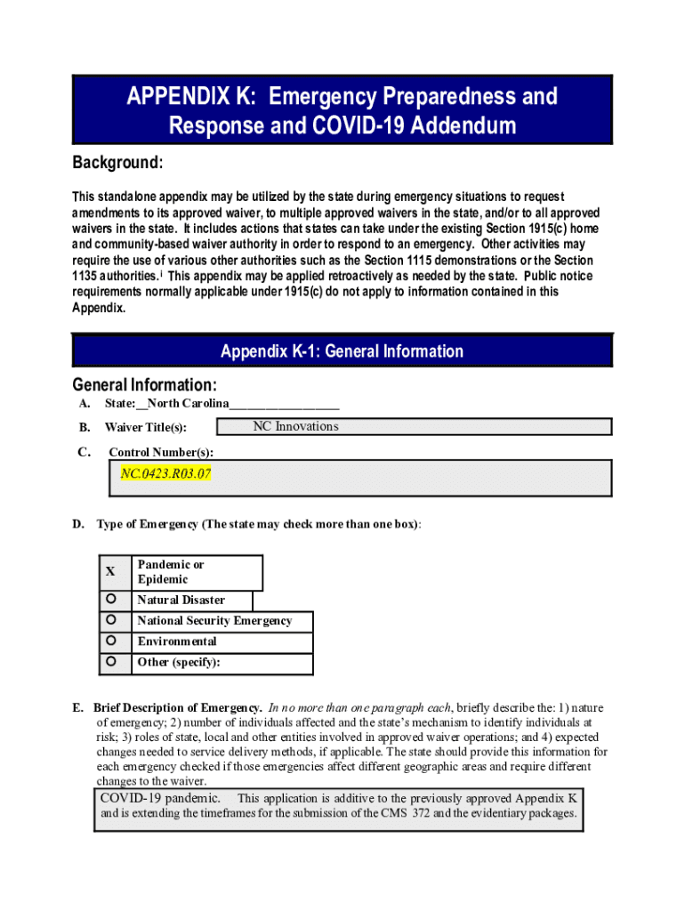 APPENDIX K: Emergency Preparedness and Response and COVID-19 Addendum Background: This standalone appendix may be utilized by the state during emergency situations to request amendments to its approved