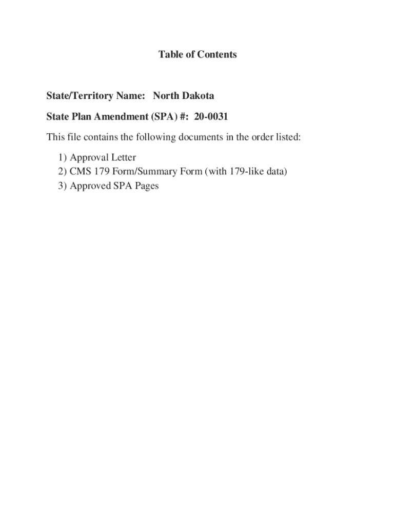 Table of ContentsState/Territory Name: North Dakota State Plan Amendment (SPA) #: 200031 This file contains the following documents in the order listed: 1) Approval Letter 2) CMS 179 Form/Summary