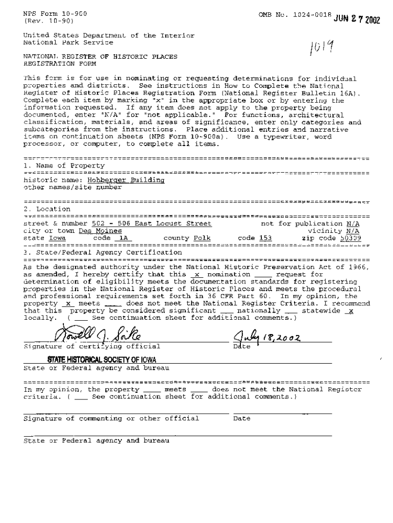 NPS Form 10900 (Rev. 1090)0 MB No. 10240018United States Department of the Interior National Park Service NATIONAL REGISTER OF HISTORIC PLACES REGISTRATION Forms form is for use in nominating or