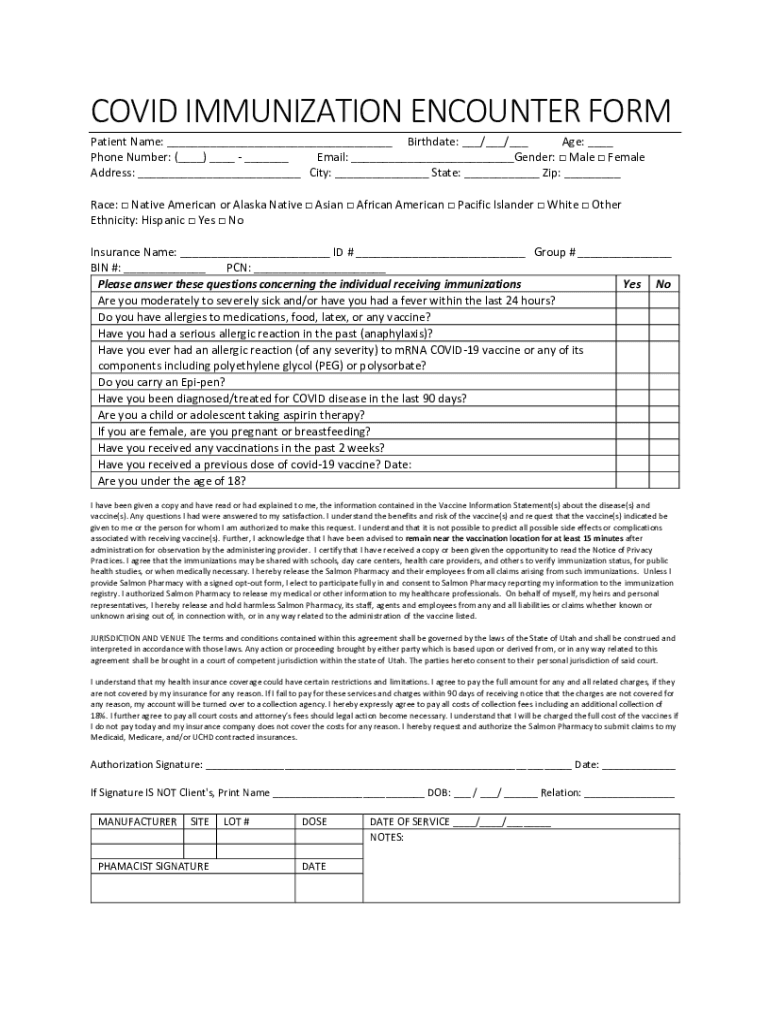 COVID-19 IMMUNIZATION ENCOUNTER FORM Patient Name: ___ Birthdate: ___/___/___ Age: ___ Phone Number: (___) ___ ___ Email: ___Gender: Male Female Address: ___ City: ___ State: ___ Zip: ___ Race: Native