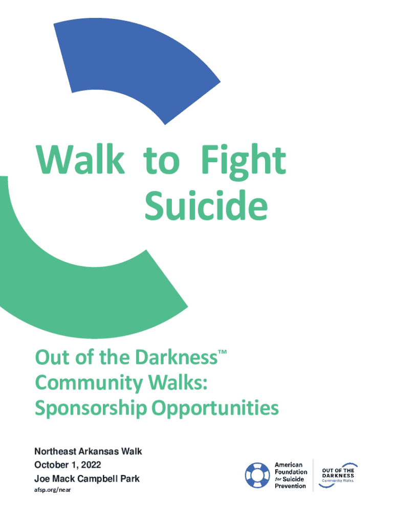 Walk to Fight Suicide of the Darkness Community Walks: Sponsorship Opportunities Northeast Arkansas Walk October 1, 2023, Joe Mack Campbell Park afsp.org/nearSPONSOR A COMMUNITY WALK You can be an