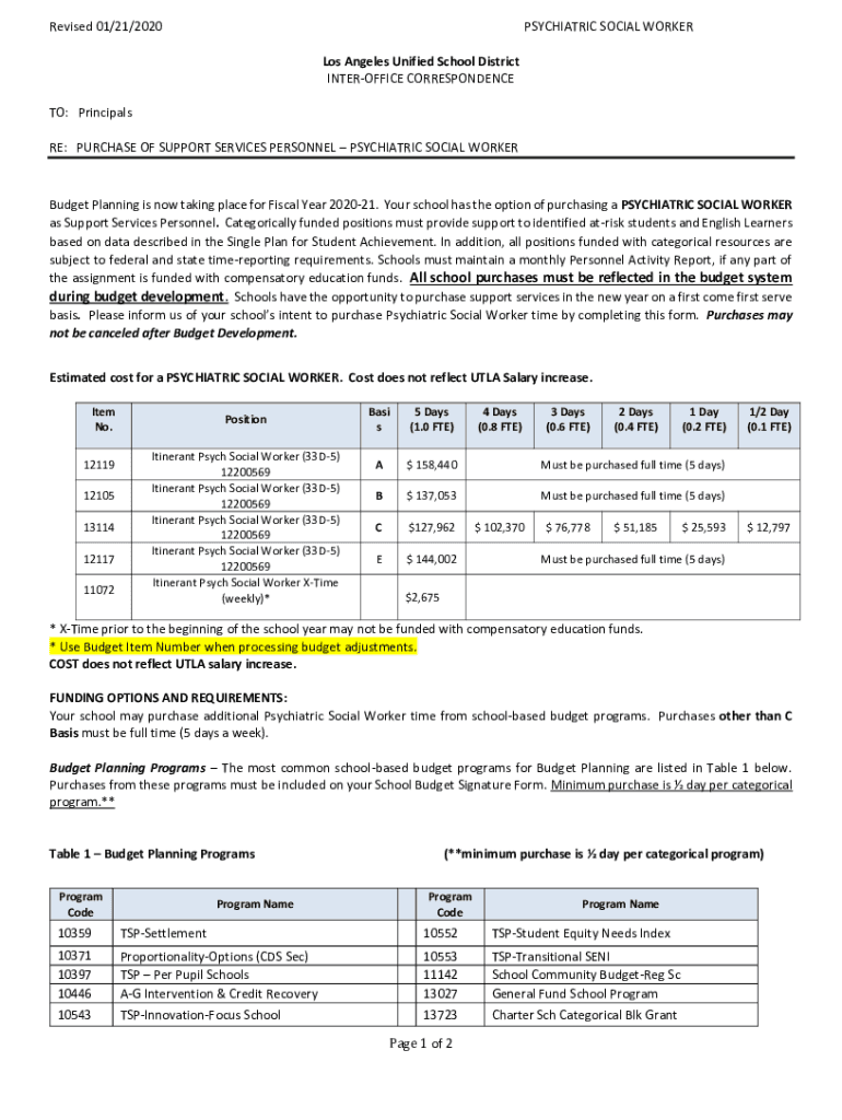 Revised 01/21/2020PSYCHIATRIC SOCIAL WORKER Los Angeles Unified School District INTEROFFICE CORRESPONDENCE TO: Principals RE: PURCHASE OF SUPPORT SERVICES PERSONNEL PSYCHIATRIC SOCIAL WORKERBudget