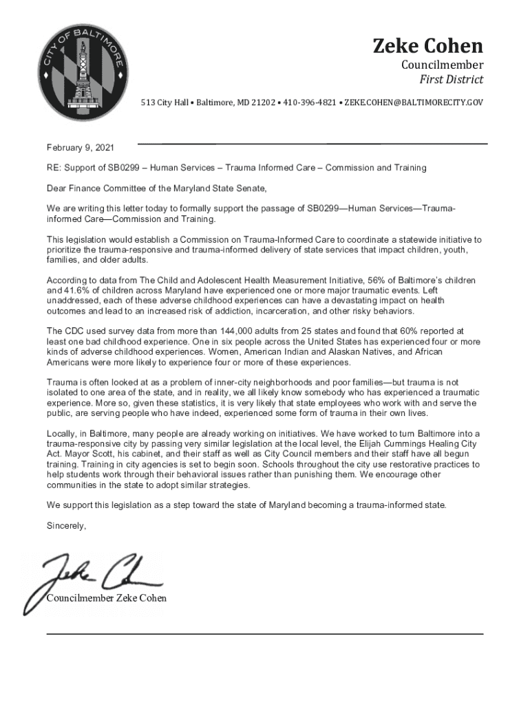 Zeke CohenCouncilmemberFirst District513 City Hall Baltimore, MD 21202 4103964821 ZEKE.COHEN@BALTIMORECITY.GOVFebruary 9, 2021