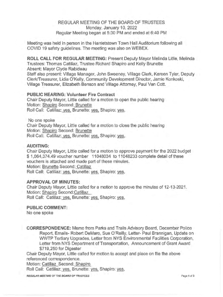 REGULAR MEETING OF THE BOARD OF TRUSTEES Monday, January 10, 2022, Regular Meeting began at 5:30 PM and ended at 6:40 PM Meeting was held in person in the Harrietstown Town Hall Auditorium following