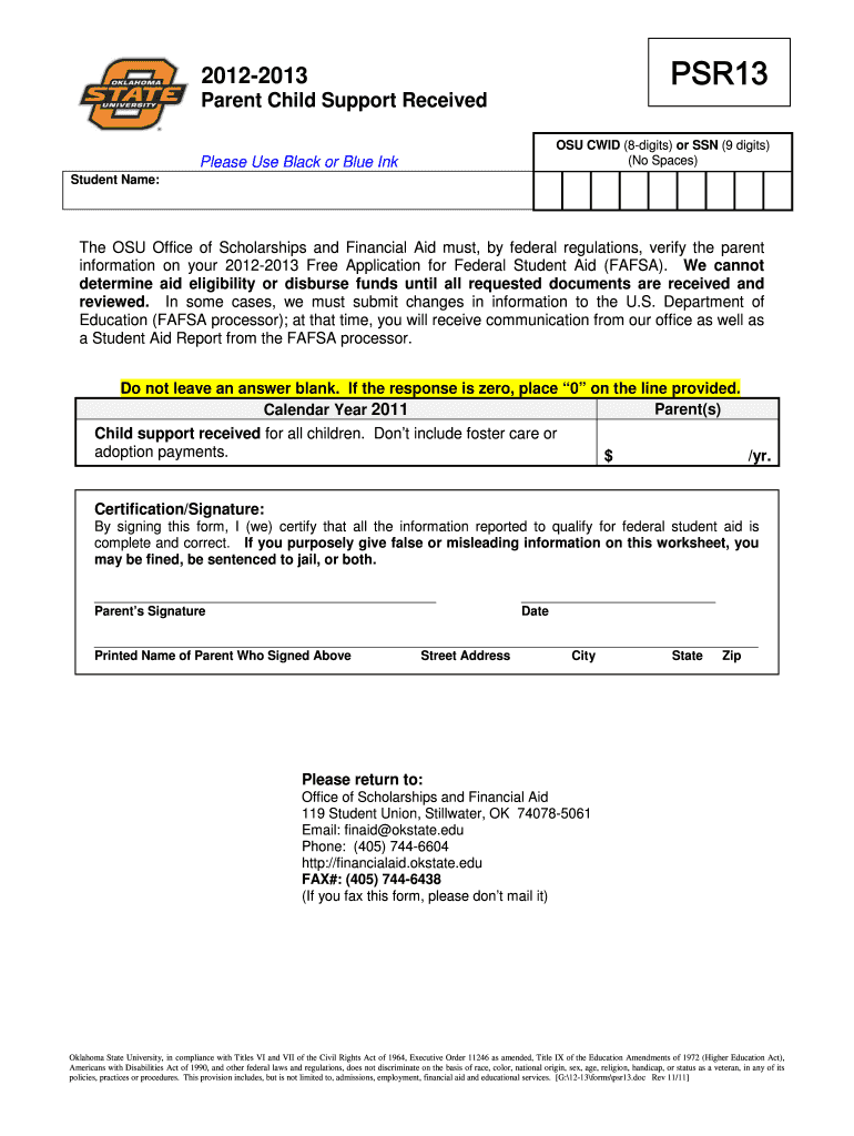 The 2012-2013 Parent Child Support Form is a financial aid document used by parents to verify child support received for Oklahoma State University's FAFSA process.