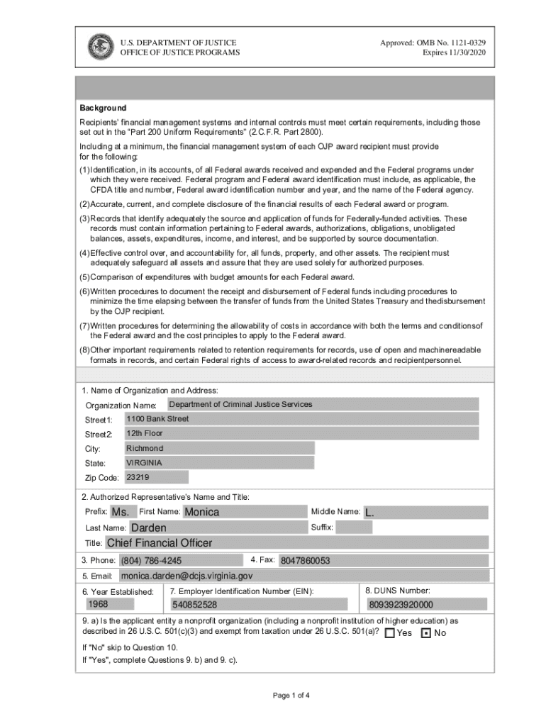 Approved: OMB No. 11210329 Expires 11/30/2020U. S. DEPARTMENT OF JUSTICE OFFICE OF JUSTICE PROGRAMSBackground Recipients financial management systems and internal controls must meet certain requirements,