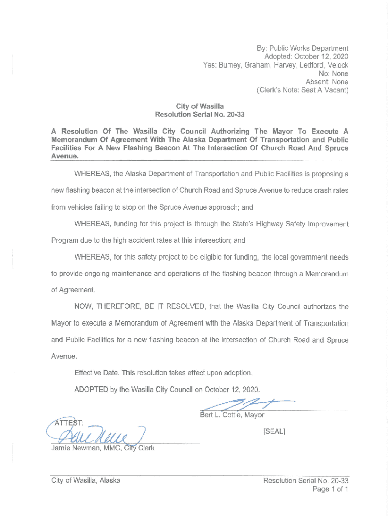 By: Public Works Department Adopted: October 12, 2020, Yes: Burned, Graham, Harvey, Medford, Ve lock No: None Absent: None (Clerk\'s Note: Seat A Vacant)City of Vanilla Resolution Serial No. 2033