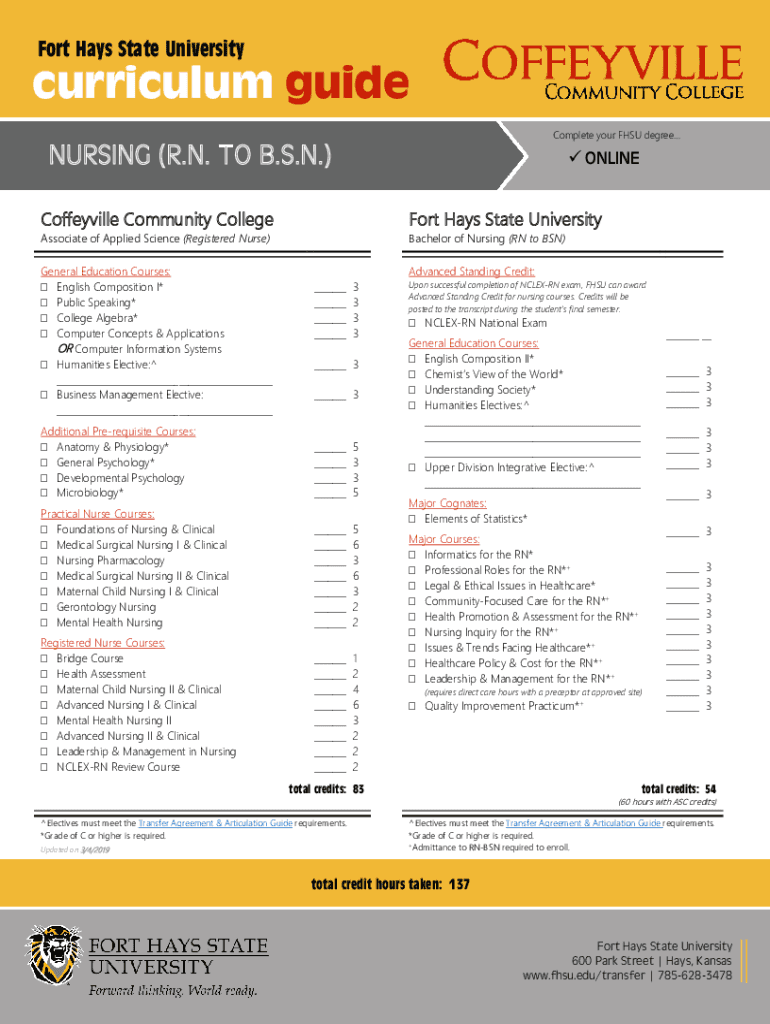 Fort Hays State University curriculum guide Complete your FSU degreeNURSING (R.N. TO B.S.N.) ONLINECoffeyville Community CollegeFort Hays State UniversityAssociate of Applied Science (Registered Nurse)General