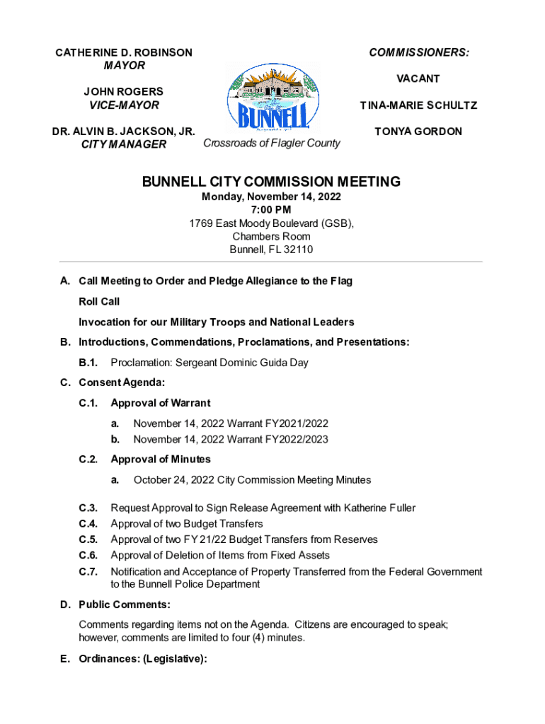 CATHERINE D. ROBINSON MAYORCOMMISSIONERS: VACATION ROGERS VICEMAYORTINAMARIE SCHULTZ. ALVIN B. JACKSON, JR. Crossroads of Flagler County CITY MANAGERTONYA GORDONBUNNELL CITY COMMISSION MEETING Monday,
