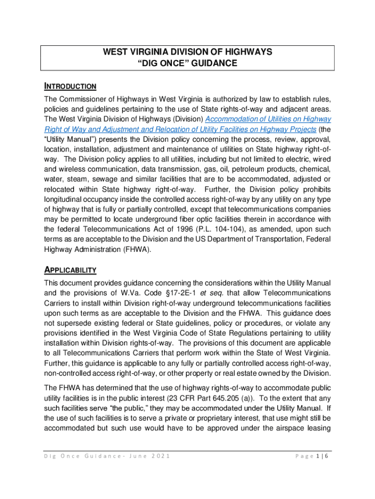 WEST VIRGINIA DIVISION OF HIGHWAYS DIG ONCE GUIDANCE INTRODUCTION The Commissioner of Highways in West Virginia is authorized by law to establish rules, policies and guidelines pertaining to the use