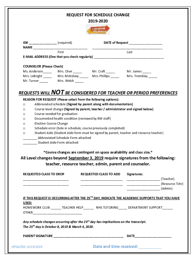 REQUEST FOR SCHEDULE CHANGE 20192020ID# ___ (required) DATE of Request ___ NAME ___ ___ First Last EMAIL ADDRESS (One that you check regularly) ___ COUNSELOR (Please Check) Ms. Anderson___ Mrs. Chen