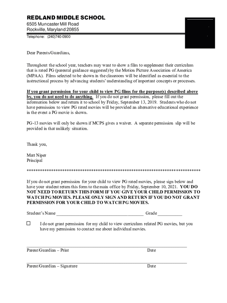 REDLAND MIDDLE SCHOOL 6505 Mun caster Mill Road Rockville, Maryland 20855 Telephone: (240)7400900Dear Parents/Guardians, Throughout the school year, teachers may want to show a film to supplement