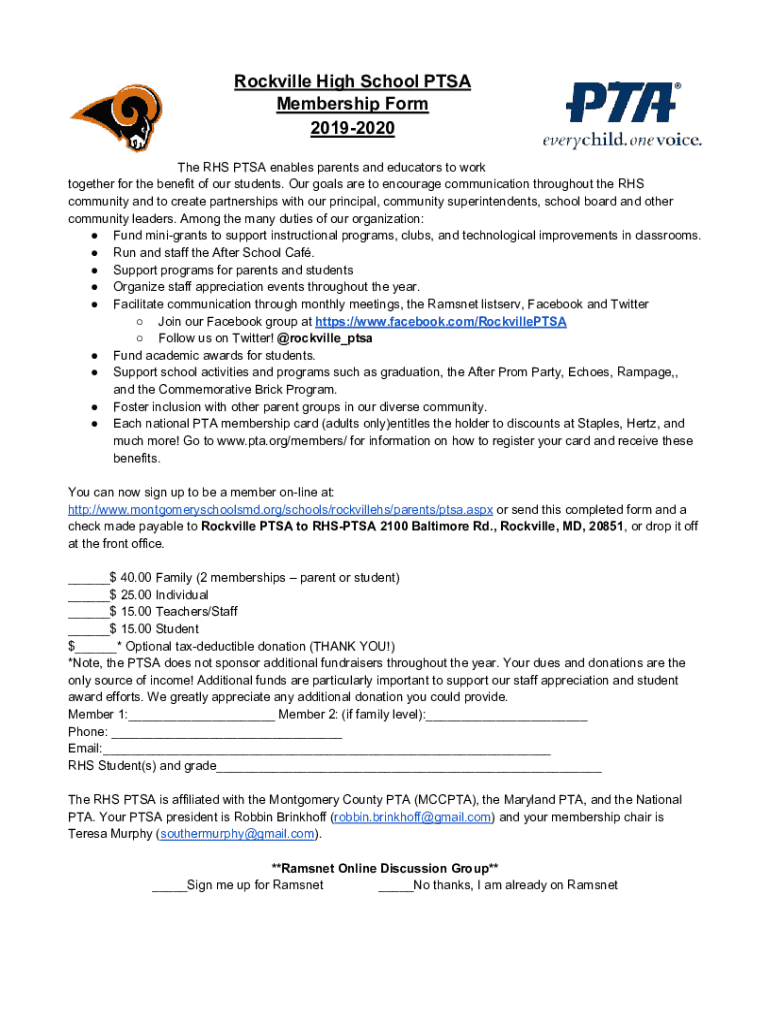 Rockville High School PSA Membership Form 20192020 The RHS PSA enables parents and educators to work together for the benefit of our students. Our goals are to encourage communication throughout the