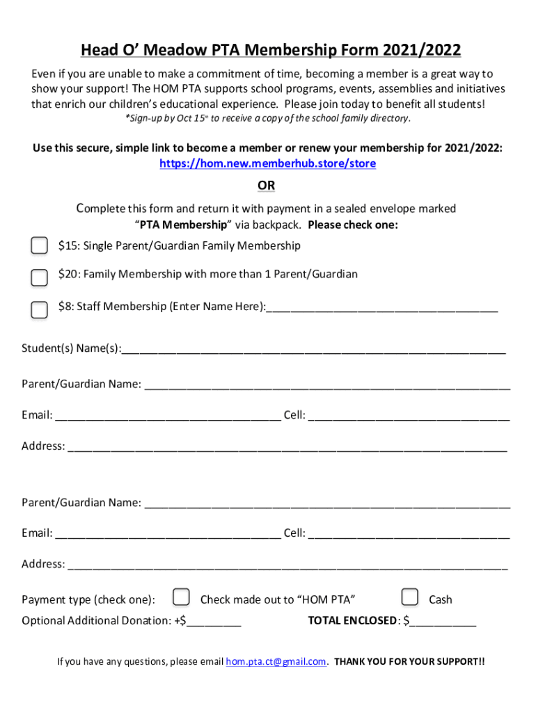 Head O Meadow PTA Membership Form 2021/2022Even if you are unable to make a commitment of time, becoming a member is a great way to show your support! The HOM PTA supports school programs, events,