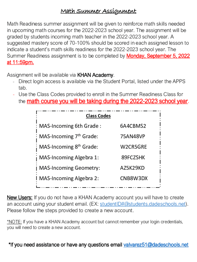 Math Summer Assignment Math Readiness summer assignment will be given to reinforce math skills needed in upcoming math courses for the 20222023 school year. The assignment will be graded by students