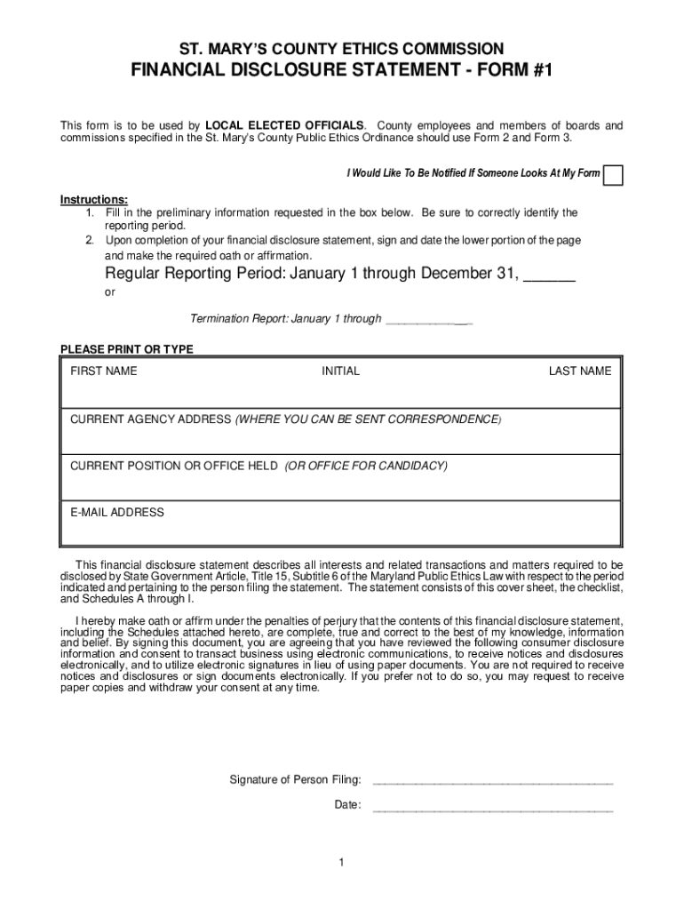 ST. MARY COUNTY ETHICS COMMISSIONFINANCIAL DISCLOSURE STATEMENT FORM #1 This form is to be used by LOCAL ELECTED OFFICIALS. County employees and members of boards and commissions specified in the