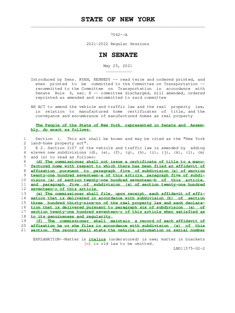 STATE OF NEW YORK ___ 7042A 20212022 Regular Sessions IN SENATE May 25, 2021 ___ Introduced by Sens. RYAN, KENNEDY read twice and ordered printed, and when printed to be committed to the Committee