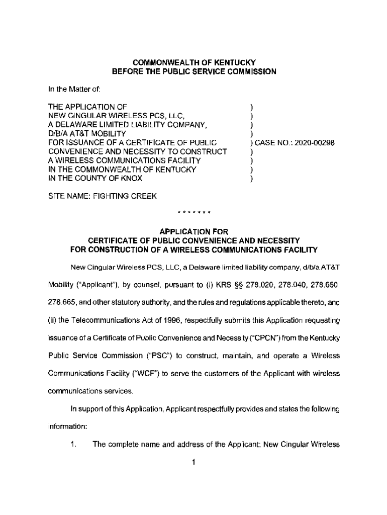 COMMONWEALTH OF KENTUCKY BEFORE THE PUBLIC SERVICE Commissioning the Matter of: THE APPLICATION OF NEW SINGULAR WIRELESS PCS, LLC, A DELAWARE LIMITED LIABILITY COMPANY, D/B/A AT&T MOBILITY FOR ISSUANCE