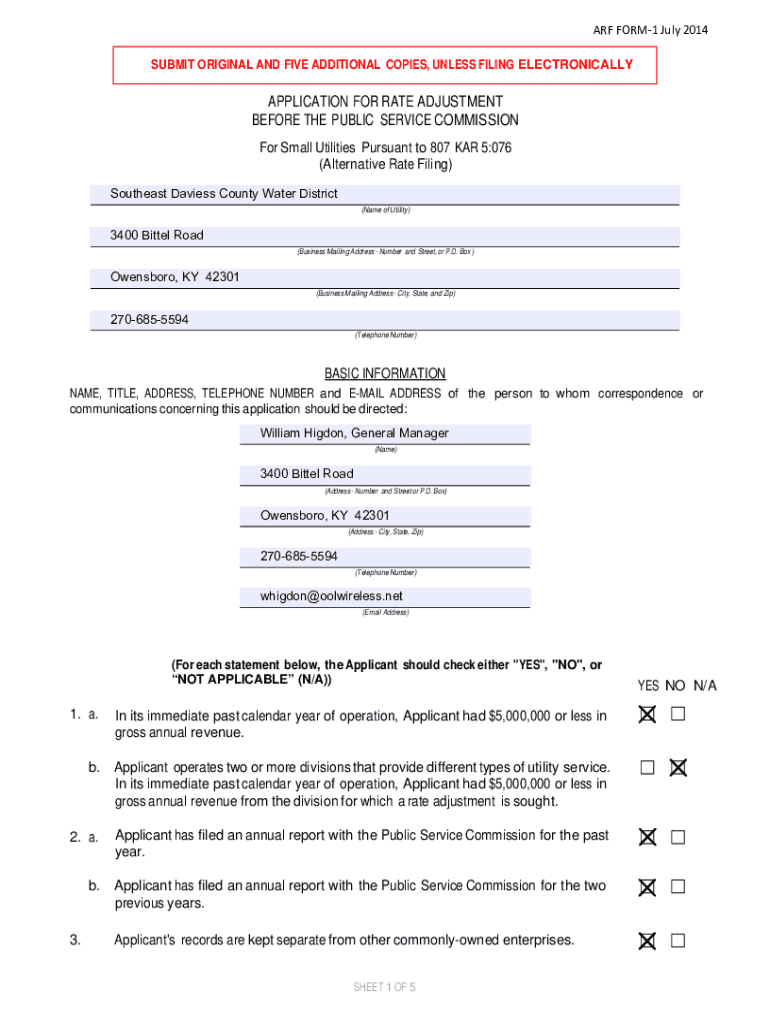 ARFFORM1July2014 SUBMIT ORIGINAL AND FIVE ADDITIONAL COPIES, UNLESS FILING ELECTRONICALLY APPLICATION FOR RATE ADJUSTMENT BEFORE THE PUBLIC SERVICE COMMISSION For Small Utilities Pursuant to 807 Cars