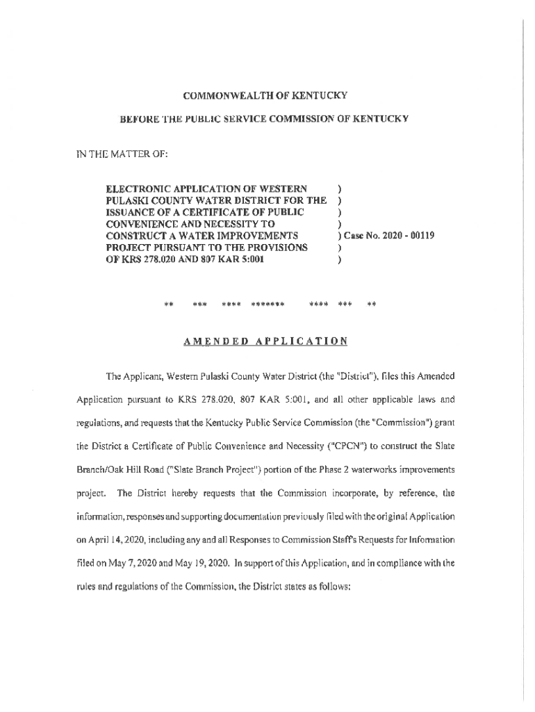 COMMONWEALTH OF KENTUCKY BEFORE THE PUBLIC SERVICE COMMISSION OF KENTUCKY THE MATTER OF:ELECTRONIC APPLICATION OF WESTERN PULASKI COUNTY WATER DISTRICT FOR THE ISSUANCE Of A CERTIFICATE OF PUBLIC
