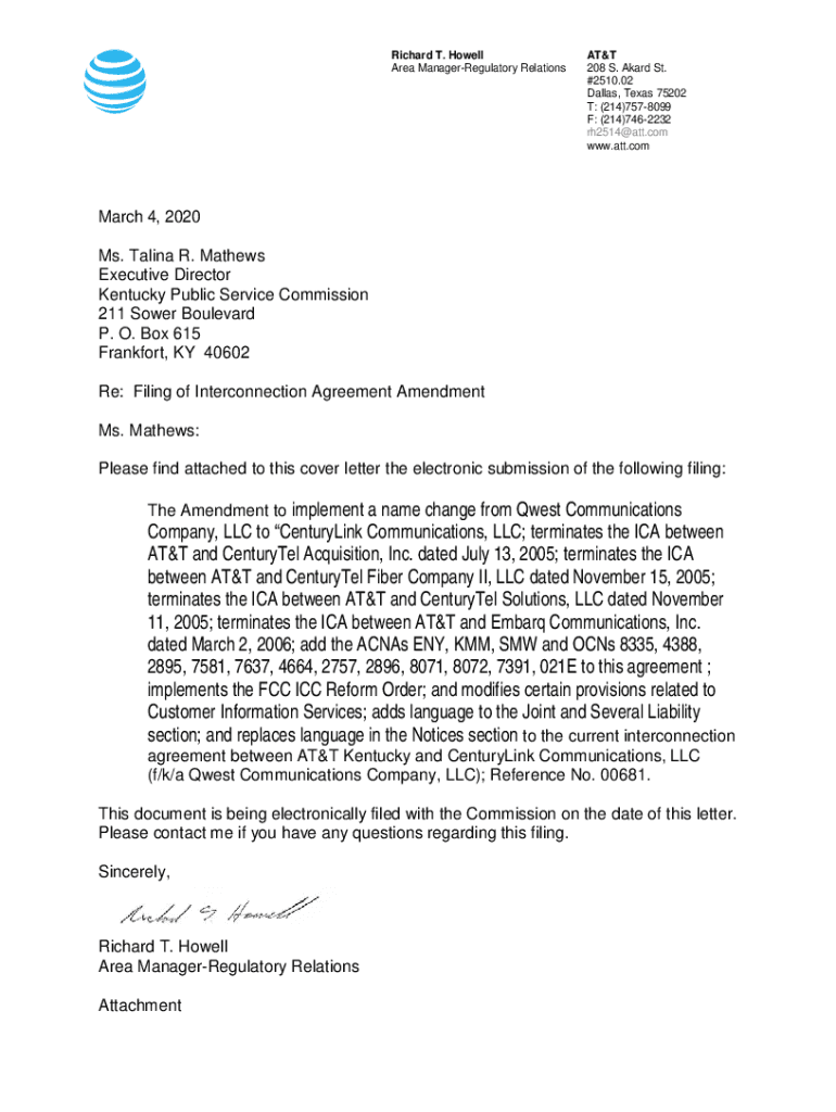 Richard T. Howell Area ManagerRegulatory Relations AT&T 208 S. Award St. #2510.02 Dallas, Texas 75202 T: (214)7578099 F: (214)7462232 rh2514@att.com www.att.comMarch 4, 2020 Ms. Alina R. Mathews Executive