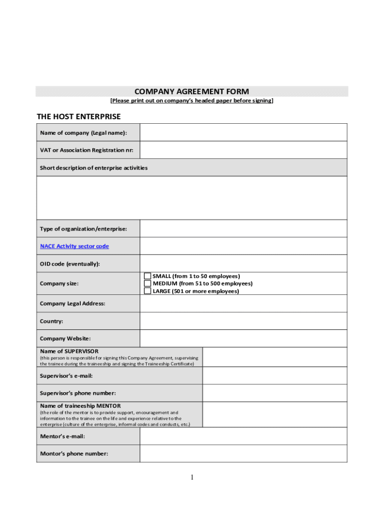 COMPANY AGREEMENT FORM [Please print out on companies headed paper before signing]THE HOST ENTERPRISE Name of company (Legal name): VAT or Association Registration NR: Short description of enterprise