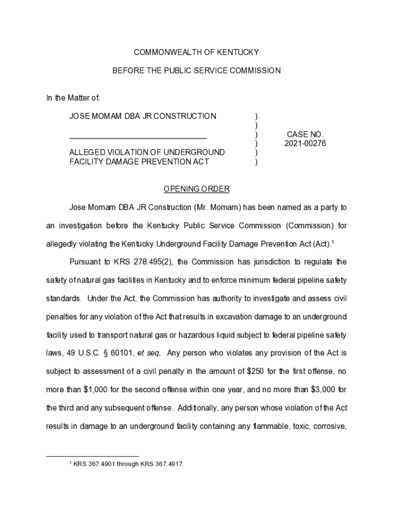 COMMONWEALTH OF KENTUCKY BEFORE THE PUBLIC SERVICE COMMISSION In the Matter of: JOSE MO MAM DBA JR CONSTRUCTION ___ ALLEGED VIOLATION OF UNDERGROUND FACILITY DAMAGE PREVENTION ACT))))))CASE NO. 202100276OPENING
