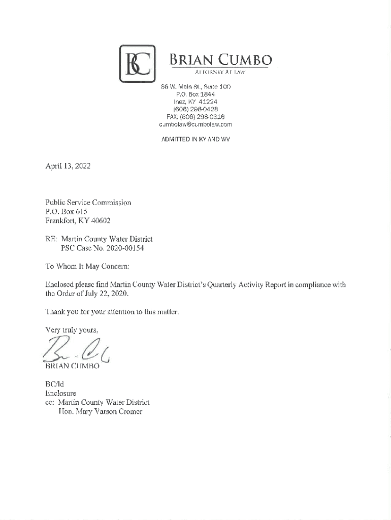 BRIAN COMBO ATTORNEY AT LAW 86 W. Main St., Suite 100 P.0. Box 1844 Inez, KY 41224 (606) 2980428 FAX: (606) 2980316 cumbolaw@cumbolaw.comADMITTED IN KY AND WV April 13, 2022Public Service Commission