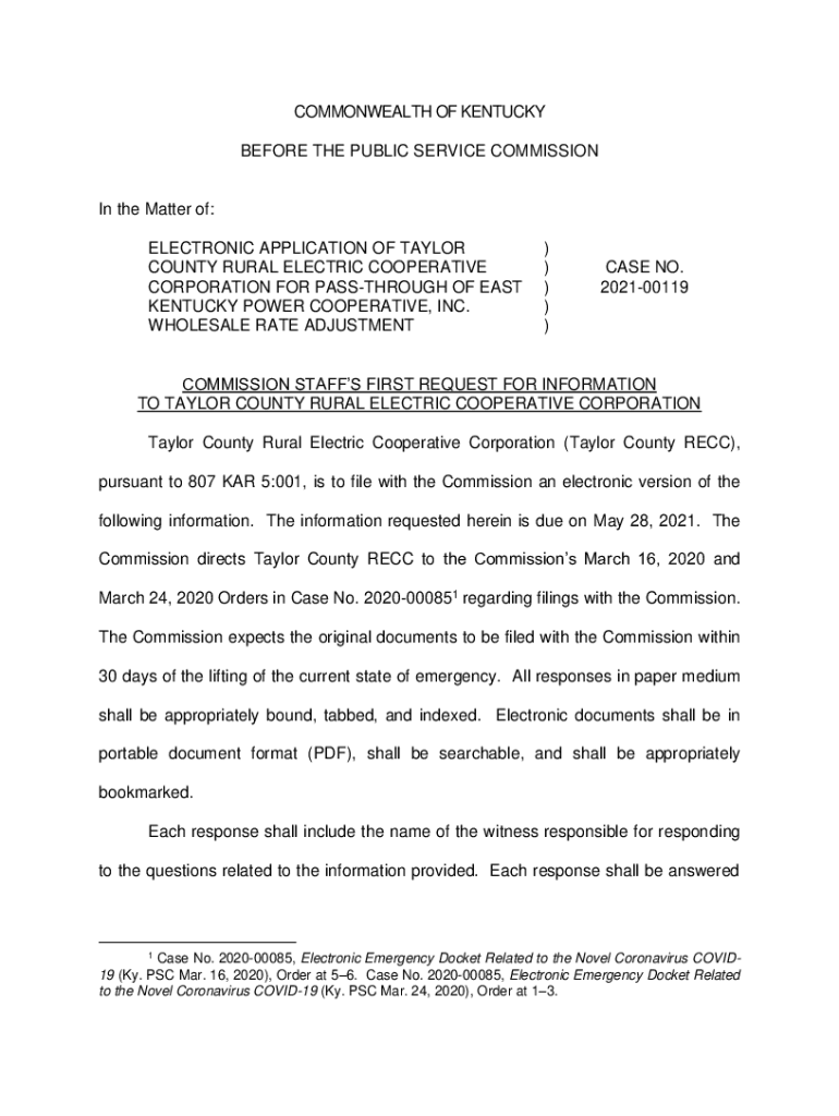 COMMONWEALTH OF KENTUCKY BEFORE THE PUBLIC SERVICE Commissioning the Matter of: ELECTRONIC APPLICATION OF TAYLOR COUNTY RURAL ELECTRIC COOPERATIVE CORPORATION FOR WALKTHROUGH OF EAST KENTUCKY POWER