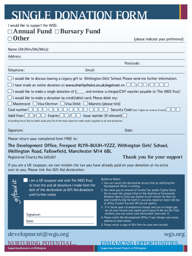 SINGLE DONATION FORM would like to support the WGS:Annual Fund OtherBursary Fund (please indicate your preference)Name (Mr/Mrs/Ms/Miss): Address:Postcode: Telephone:Email: I would like to discuss