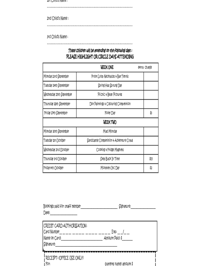 1st Child's Name : 2nd Child's Name : 3rd Child's Name : These children will be attending on the following days :PLEASE HIGHLIGHT OR CIRCLE DAYS ATTENDING WEEK ONE Monday