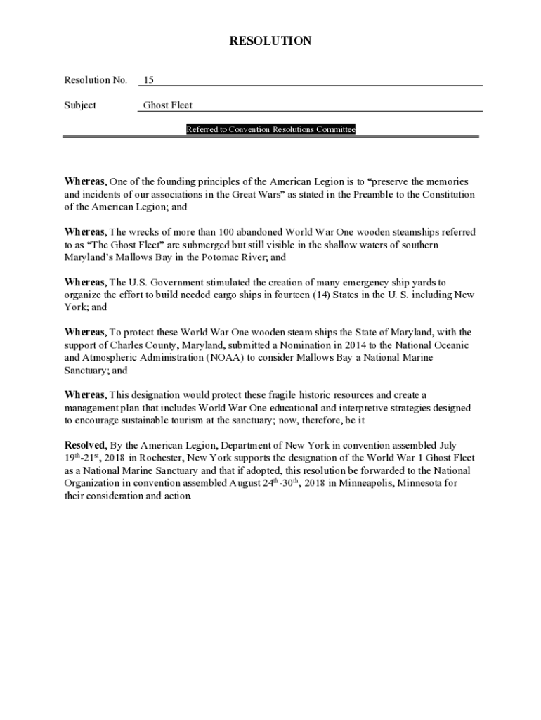 RESOLUTION No.15SubjectGhost Fleet Referred to Convention Resolutions CommitteeWhereas, One of the founding principles of the American Legion is to preserve the memories and incidents of our associations