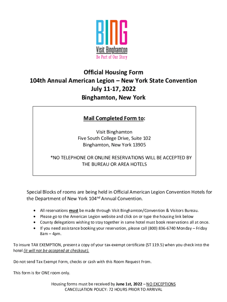 Official Housing Form 104th Annual American Legion New York State Convention July 1117, 2022 Binghamton, New York Mail Completed Form to: Visit Binghamton Five South College Drive, Suite 102 Binghamton,