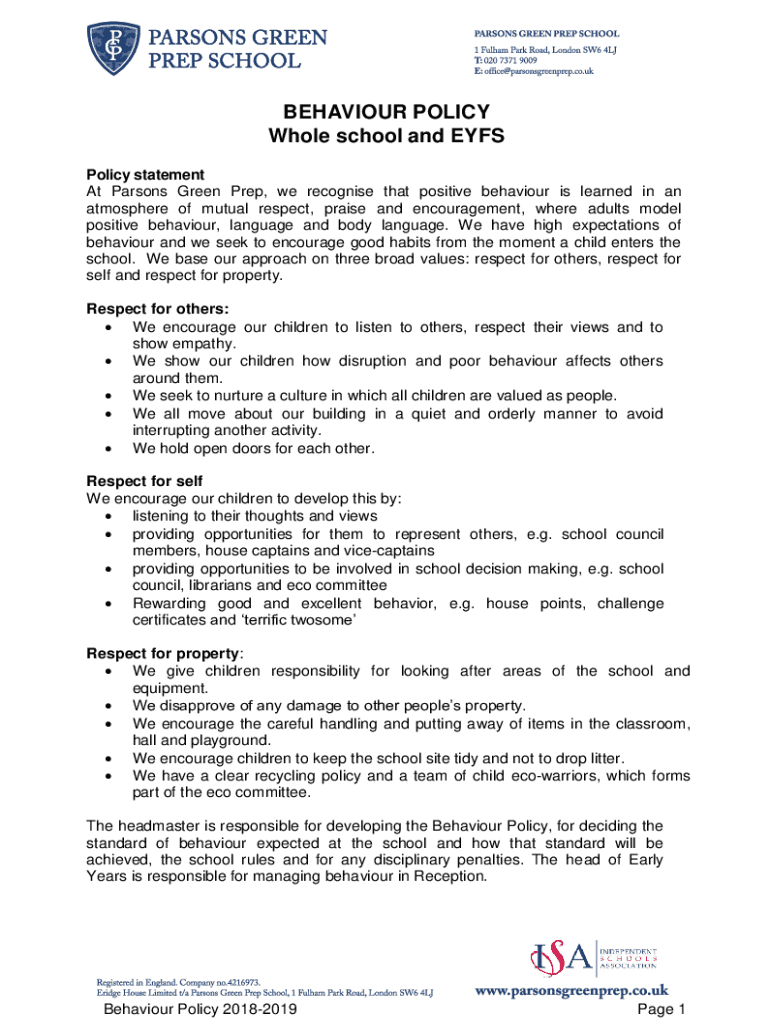 Behavior POLICY Whole school and EYES Policy statement At Parsons Green Prep, we recognize that positive behavior is learned in an atmosphere of mutual respect, praise and encouragement, where adults