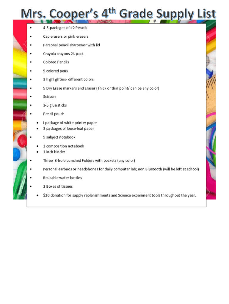 45packages of #2 Pencils erasers or pink erasersPersonal pencil sharpener with lid Crayola crayons 24 varicolored Pencils5 colored pens3 highlighters different colors5 Dry-Erase markers and Eraser